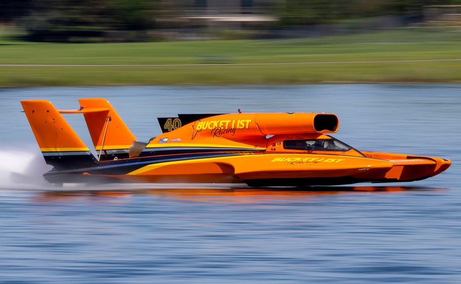 The Unlimiteds are powered by turbine-engines that produce around 3,000 horsepower – allowing our drivers to reach speeds of nearly 200 mph and producing a massive 60-foot tall, 300-foot long wall of water called a “roostertail” behind them. With very few restrictions, these majestic hydroplanes race in front of shorelines packed with fans on bodies of water throughout the United States.