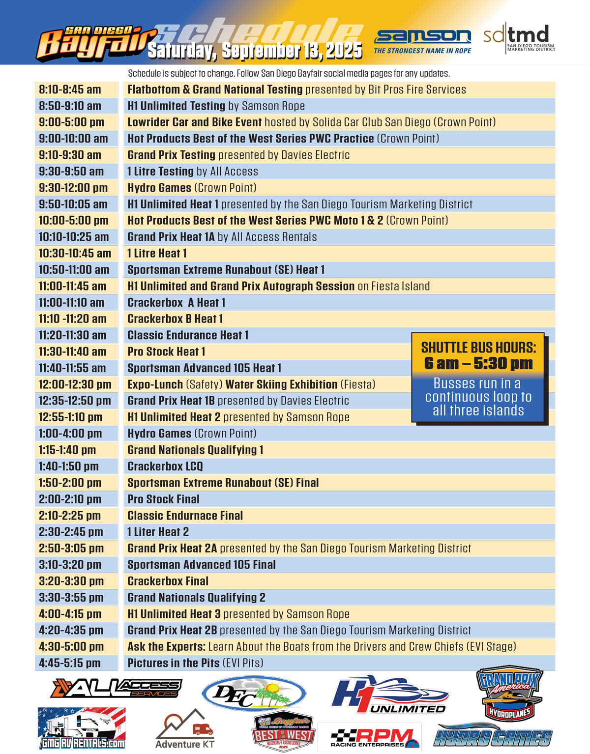 In addition to admission to activities and pit row, on Fiesta Island Bayfair offers overnight R/V spaces in Mission Bay Park and the only time of year for beach camping on East Vacation Island, all overlooking the azure blue race course.