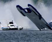 The Unlimiteds are powered by turbine-engines that produce around 3,000 horsepower – allowing our drivers to reach speeds of nearly 200 mph and producing a massive 60-foot tall, 300-foot long wall of water called a “roostertail” behind them. With very few restrictions, these majestic hydroplanes race in front of shorelines packed with fans on bodies of water throughout the United States.